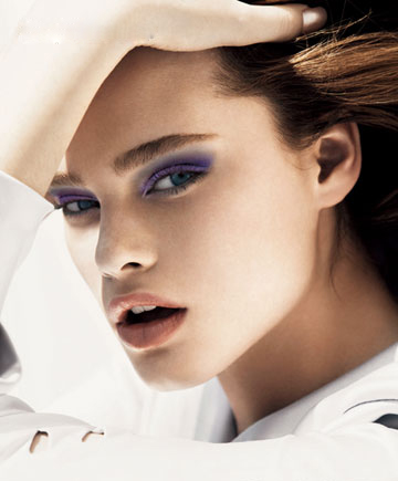 淡紫色和灰色的组合极易抓住光线,因此能让眼睛看上去自然明亮,随之整个脸庞都像晕满了光彩。在睫毛根至双眼皮褶皱处涂上淡紫色,在其上至眉骨处则使用带珍珠光泽的灰色。同时在内眼角和下眼睑的眼尾处也刷上灰色眼影,以平衡整个眼妆。最后,用一个大号的干净刷子横向轻扫整个眼睑,模糊上下颜色的交界线,一个看上去如童话公主般浪漫的眼妆便完成了。