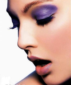 1.在眼折处 以笔刷沾取灰蓝眼影膏 在眼折处打底 再利用手指或是笔刷 将灰蓝色眼影膏的线条外围晕染 会让眼睛有深邃感