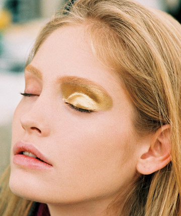 在金色眼影上画一条粗细适当的眼线,画眼线时不妨将脸部的角度调整得低一点,可以让眼尾有自然的幅度。在黑眼球的上方,轻轻地重复加强描绘,由眼角往眼尾方向慢慢加粗,然后用棉花棒将描绘过的眼线晕开,可以让眼线线条变得柔和、立体。