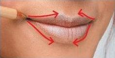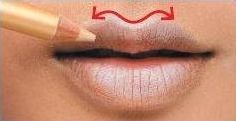 1、M型线条是唇形完美的重点。在唇峰的M线部分,用裸金色唇线笔,顺着M型修饰,制造明亮的嘟唇效果。