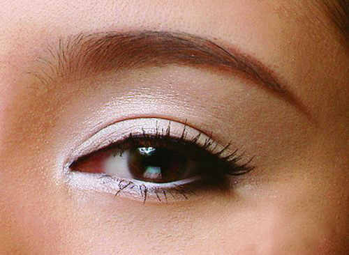 1.白色眼影裹住眼眸:用眼影刷蘸取白色眼影,先从睫毛根部开始刷,重点要把内眼角整个包裹住,再把整个眼窝处用白色铺满,下眼睑可以适当加粗。