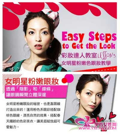 步骤三 用眼影刷在整个眼窝大片刷上的粉红色系珠光眼影,下眼睑也别忘了要刷上一点,提亮整个眼神。
