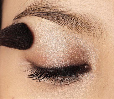 1. 将珍珠金色及古铜金色眼影扫于眼睑打底,突显眼部轮廓。