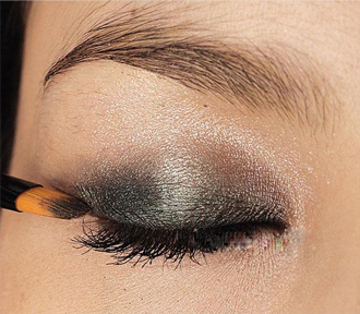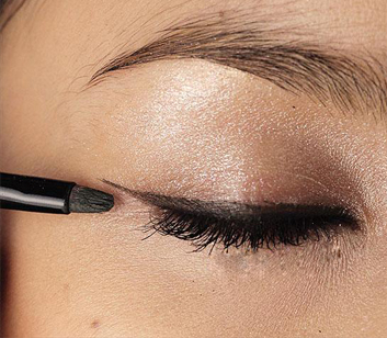 3. 以扁平的眼线扫沾取墨绿色眼线膏,在眼窝位置推匀。