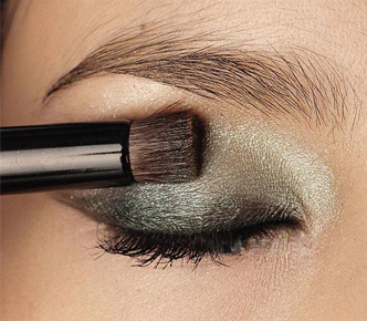 4. 将绿色眼影从眼睑前端扫至眼尾。