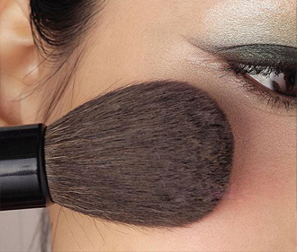5. 在面颊中心扫上粉红色腮红,而颧骨位则扫上金色蜜粉。