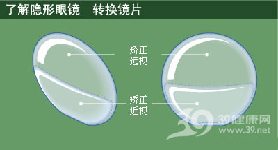 转换镜片模仿了双焦点眼镜。镜片分为两部分,顶部矫正远视,底部矫正近视。