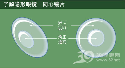 同心双焦点镜片的中心有一个矫正近视的小圈,小圈周围的外透镜则用于矫正远视(反之也可,即镜片中心矫正远视,镜片外围矫正近视)。