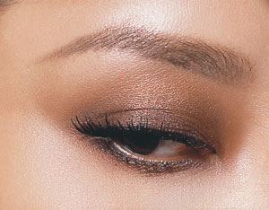 用制度蘸取浅棕色眼影涂抹整个眼窝,让眼影的光泽更细致服帖。然后用红棕色均匀涂抹,再用深棕色眼影涂抹靠近睫毛根处,最后蘸取少量的粉色电量眉骨处。