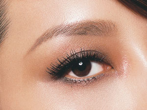 先将深棕色眼影轻刷在下睫毛根处,然后再用红棕色眼影晕染约0.5cm的下眼线,微微拉长眼线,与上眼睑相接。