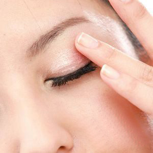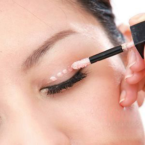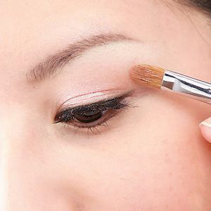 STEP1.双眼皮摺稍高处点上粉红色眼蜜。涂太低眼睛张开就看不见;涂太高眼睛会显得浮肿。