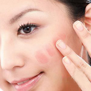 STEP4.微笑,在鼓起的笑肌点上霜状或液状腮红,如果圆脸比较圆的人可以将腮红再往后加至颧骨处。