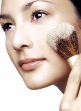 腮红:选出适合色系的腮红,对着镜子微笑,颧骨的部位就是腮红可以打上的部位。使用时每次的腮红量要少、要淡;可多刷几次直至效果完美。