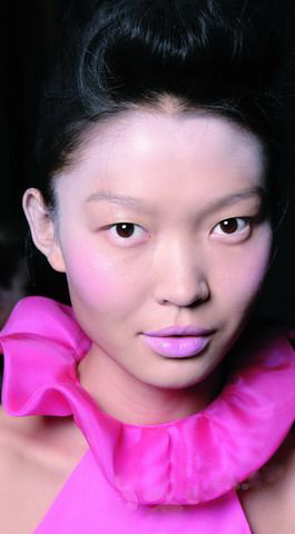 如果你的鼻梁很低,并非用高光、阴影把鼻梁弄高些就能有立体感,而是应该巧妙“避短”,把注意力转移,比如用白色给面部打个轮廓,就能轻易打破面部扁塌,再用腮红突出圆润的颧骨,就能打造既柔美又立体的清淡妆容。