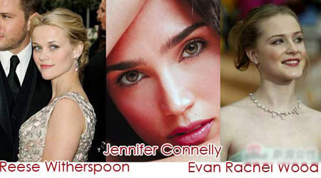 Reese Witherspoon, Jennifer Connelly 和 Evan Rachel Wood用微微发亮的铜色眼影勾画她们的眼睛,并且大胆地涂了黑色眼线和眉毛。