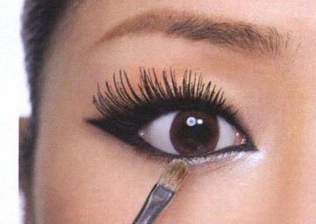 step4:利用银色珠光眼影,浅浅刷在下眼头前三分之一处,借由打亮的点缀效果,不但令眼形加倍迷人,双眸也水汪汪。 step5:先将睫毛夹翘后,用黑色睫毛膏从睫毛根部往上刷拭,不仅能同时增加浓密度和纤长感,更使眼妆立体动人。