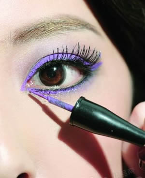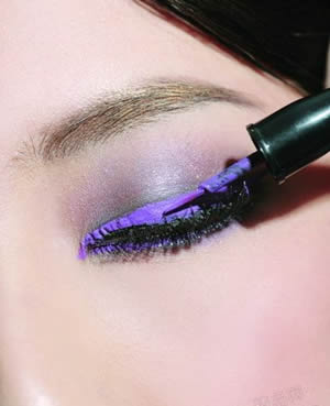 3.下眼线同样用紫色眼线液覆盖,关键在于内眼角,让眼线在这里呈尖尖的三角形延伸。不但能造成拉长眼形的视觉效果,还让你看起来更性感。
