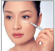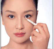 选择含有果酸、麴酸、左旋维他命C与维他命K等美白除皱成分,或者具有促进眼部循环的眼霜。在下眼睑下方,从内眼角开始往外依次点上3滴眼霜,然后用无名指以按压的方式由内向外轻轻按压 至太阳穴,再反方向按压至眼睑与鼻梁相接处,如此来促进眼睛周围的血液循环。