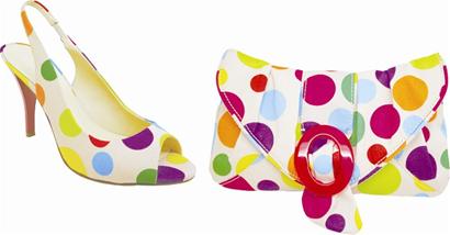 今季除了服装设计,鞋子也出现了波普风情。记者在国际广场玖熙鞋柜看到了一双以黄、橙、红、紫等亮色波普圆点为色调的高跟女鞋,与之相搭配的还有一个色系相同的手抓包,因为非常可爱,所以大受年轻女性顾客的喜爱。