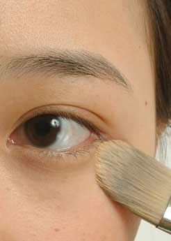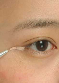 先用小刷沾较厚实的遮瑕膏,沿纹路方向,从眼角向外发散描画,填匀。