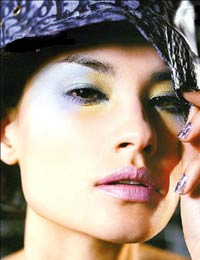 化社交妆时,上下眼线的周围都要加蓝,唇彩用清透而魔幻的浅冰蓝,仿佛不食人间烟火的样子。穿白色、蓝色礼裙时,还可以加上至少两米的冰蓝长丝巾。化日常妆时,蓝色要用得少,用得简约,一般只在上眼线处加隐约一笔,其他眼妆部位只加冰白色,以突出眼睛的光泽。为更具亲和力,唇彩用冰红、冰紫红为妙。冰蓝在公务场合显得太拒人千里之外了。