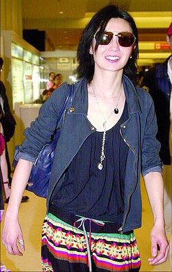 张曼玉的复古型太阳眼镜与民族花纹图案的裙子非常相配。