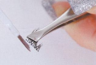 2.用镊子夹住假睫毛,在假睫毛根部涂抹胶水