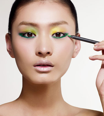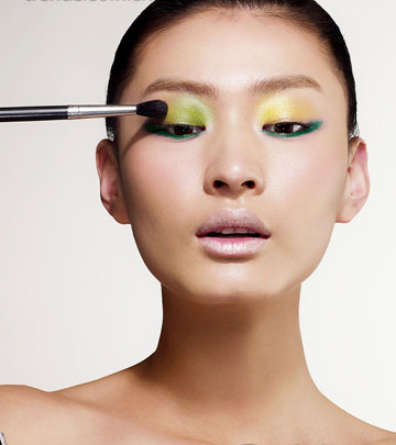 彩妆师为你建议三种组合:浅绿+鹅黄,藕荷+粉紫,银灰+宝石蓝,这三款都符合相同色系深浅搭配的原则,轻松上手不出错。眼影晕染时要特别注意衔接过渡,将界限模糊掉,并保持两边的效果一致。