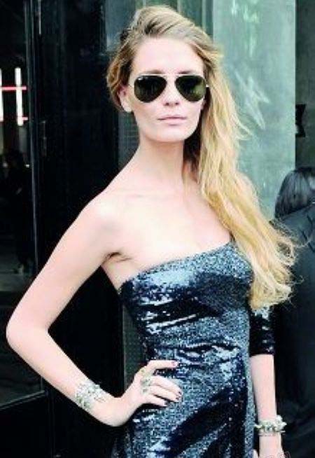 米莎·巴顿的脸型有点偏方,不够圆润,所以,她很聪明地选择了蛤蟆镜,收紧了下半部脸的轮廓。蓝色的镜框在夏天显得非常清新、出挑,而且与服装上的色彩也很协调。