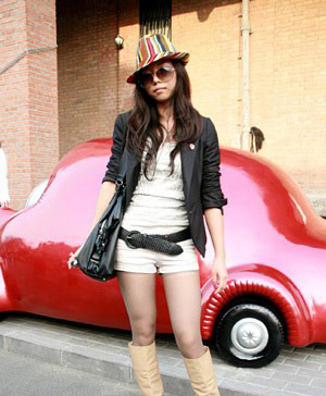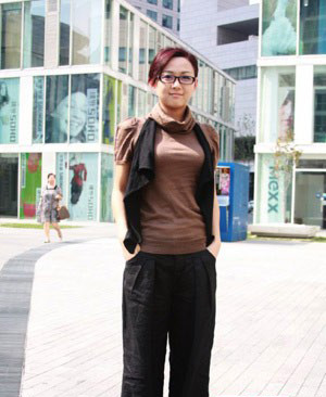 一看就知道宽腿裤适应的人群当然是粗壮腿的mm了,这个mm穿得貌似朴素又极为耐看,虽然是黑色系主打的,那个头发染红了倒是极为特别了。