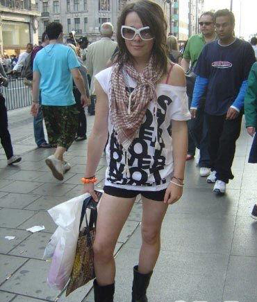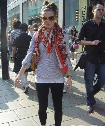 夸张的白边太阳镜与全身的主体T恤相呼应,整体感觉很和谐。丝巾也是亮点,但炎热的夏季不为实用,可以用夸张的配饰代替丝巾。