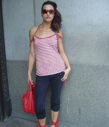 全身的色调是红色,蓝色的短裤很好的协调了太多红色的交叉和对比,整体协调,耐人寻味。