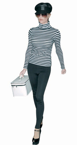 点评:Victoria Beckham巧用条纹的活跃感,打破整体黑配白的单调,礼帽、太阳镜、手提箱、高跟鞋,都围绕条纹的元素展开了奇妙的旅行。