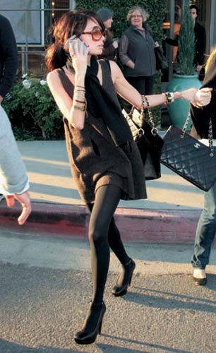点评:略显颓废的Nicole ,将黑色连衣短裙、黑色丝巾、黑色手袋和高跟鞋组合在一起,更显纤瘦,各式风格的手链混搭丰富细节的华丽感。