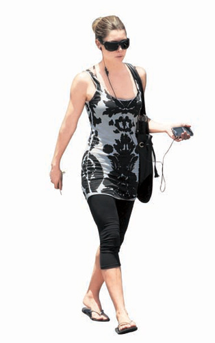 点评:Jessica的黑白印花长款T恤搭配蛤蟆镜和七分裤袜,绚酷的格调不乏热辣感,让运动的质感也可以变得如此高调。