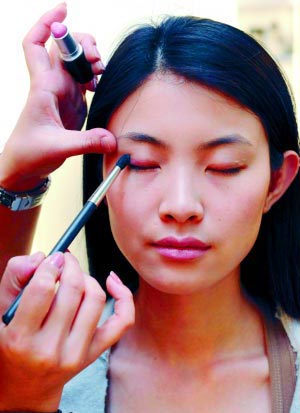 在后台化妆时,有时候找不到同色系的眼影,化妆师就会用口红代替,既能搭配也算是救救急。如果你也没有合适的眼影,在某些时候也需要“救急”。用口红做眼影,在妆前最好用专门的妆前眼霜或者眼部粉底液,眼部定妆效果好,也不用担心口红的颜色会结块以及口红的油分对眼部太过油腻。 双眼皮的人把口红用作眼影会比较方便,直接用刷子蘸少许,就像平时画眼影一样,加在双眼皮之间和之上,贴近睫毛的部分可以颜色重些,然后慢慢过渡变浅。 这一步不能用手上色,否则容易上色不匀,出现一块块的。