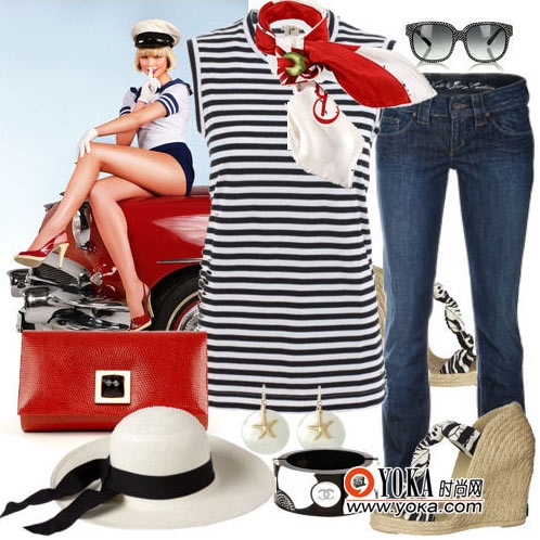 条纹是属于海军的图案,加上一条红色的小围巾更显浪漫。大檐帽和草编鞋加重了度假的气氛。