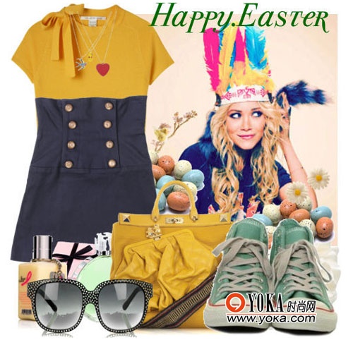 黄色手袋 Marc Jacobs 约合人民币14657元,黄色T恤 约合人民币2630元,绿色球鞋 Converse 约合人民币8145元,双排扣抹胸裙 约合人民币345元,小雏菊耳钉 约合人民币81元,项链 约合人民币54元