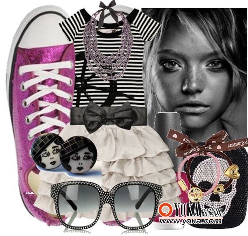 项链 Vera Wang 约合人民币17657元,黑色蝴蝶结腰带 约合人民币2114元,爱心头绳 约合人民币122元,条纹T恤 约合人民币640元,白色蛋糕裙 约合人民币407元,骷髅头珠宝手包 约合人民币3008元,玫红色球鞋 Converse All Star 约合人民币459元,人头像耳钉 约合人民币40元