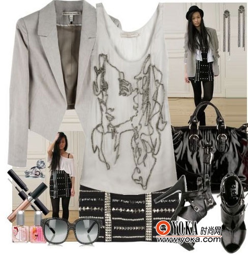 黑白迷你裙 Balmain 约合人民币53381元,灰色小西装 约合人民币2465元,黑色手袋 Suzy Smith 约合人民币773元,耳环 约合人民币537元,戒指 约合人民币1629元,背心 Stella McCartney