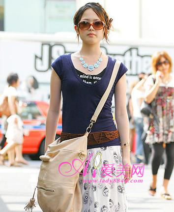搭配要点:骷髅图案民族长裙+时尚腰带+印花项链+小框墨镜+帆布大包,这位MM的搭配和架势,咋看还以为是那位明星日常节拍装呢!盘发搭配墨镜更能拉长脖子以上的视觉感,建议小个子MM学习。