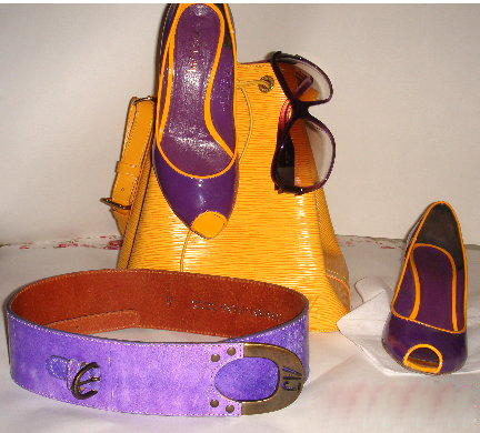 黄色水桶LV ,紫色漆皮裹黄边:pepe,腰带:阿玛尼。紫色墨镜:GUCCI