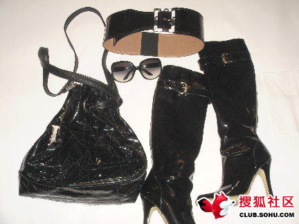 黑色漆皮水桶包:Dior,黑色墨镜:Dior。黑色漆皮靴子:GUCCI,黑色漆皮腰带:Pepe