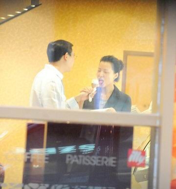 过了马路,董卿和男友一起进了一家蛋糕店,她先给男友买了一支冰激凌,然后自己挑选蛋糕。男友斯文地吃了几口,就亲密地把冰淇淋喂给董卿吃,董卿表情自然,轻启朱唇,咬了一口,然后嫣然一笑。出了蛋糕店两人一起向商场的大门走去。