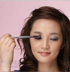 眼线干后,用与眼线同色系的浅蓝色眼影扫眼窝,再重复2-3次扫眼睑,形成内深外浅的层次。