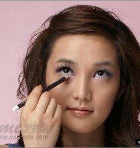 用白色眼线笔勾画下眼线,从眼角向眼尾,整个填满下眼线,在眼尾处无需拉长。