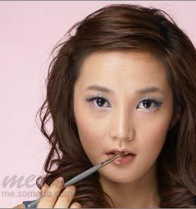 唇刷取适量奶茶色唇膏,上嘴唇从唇峰、下唇从唇腹部往两边刷,突出嘴唇的线条。