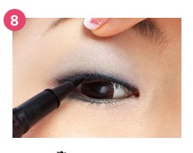 8 用眼线液沿着刚才画的眼线在描一次。画的时候可以用手指按住上眼睑拉开眼皮,比较容易画。以眼线笔加眼线液可以勾勒出很鲜明的眼形,且不会显得眼神很严厉。