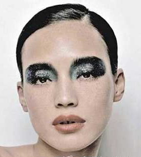 舒淇的大面积晶亮的蓝绿色眼影,这个眼影恐怕用在谁脸上都不好看,只有舒淇的气场压得住这样的浓妆。