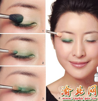 Step4:这时你觉得黄色在整个眼妆亮得有点过,恐怕在办公室里显得有点夸张,这时就轮到绿色出场。刷在黄色之上,立马令黄色不再如此抢眼,将黄色调节到办公室妆容中的适度亮泽。